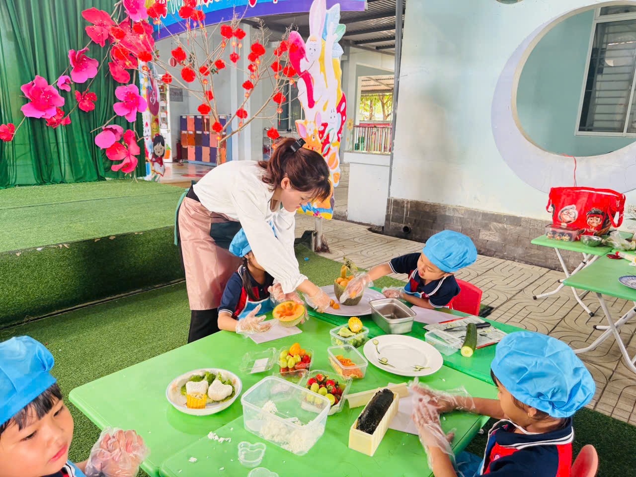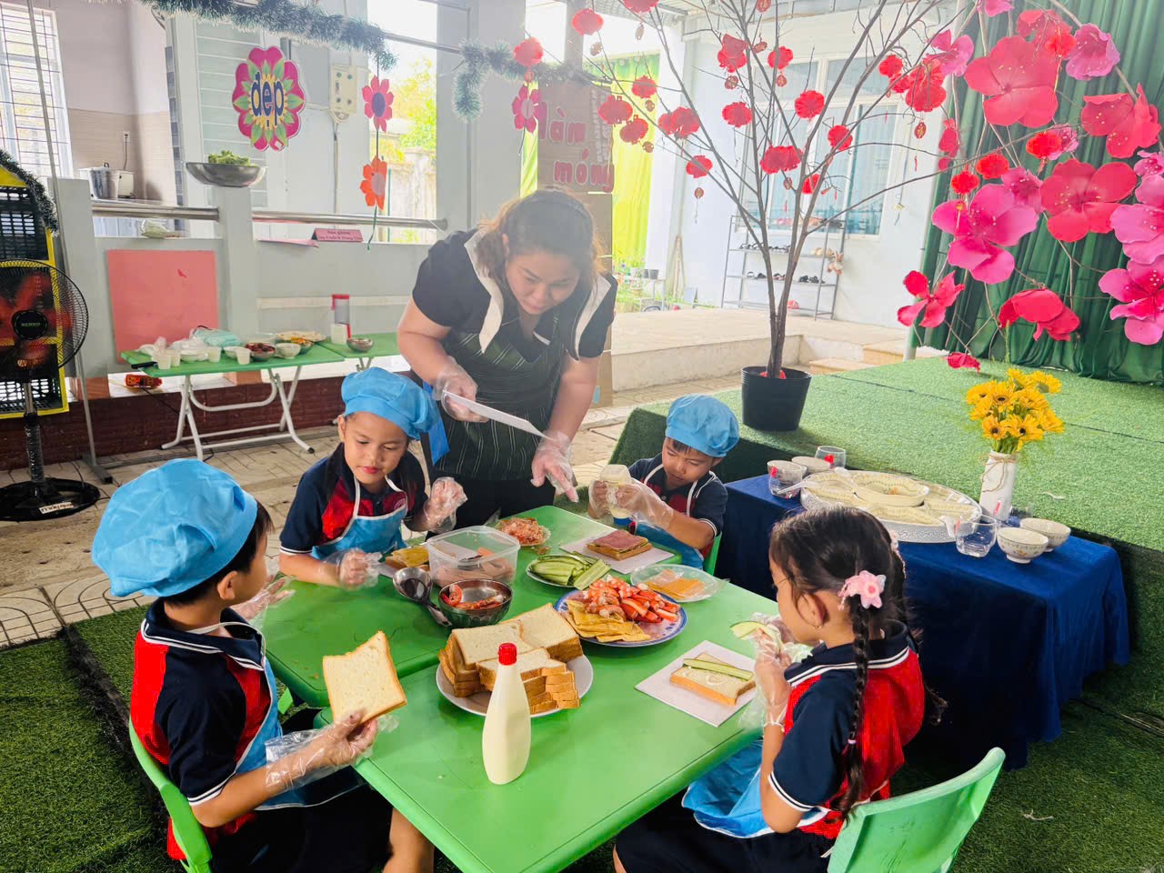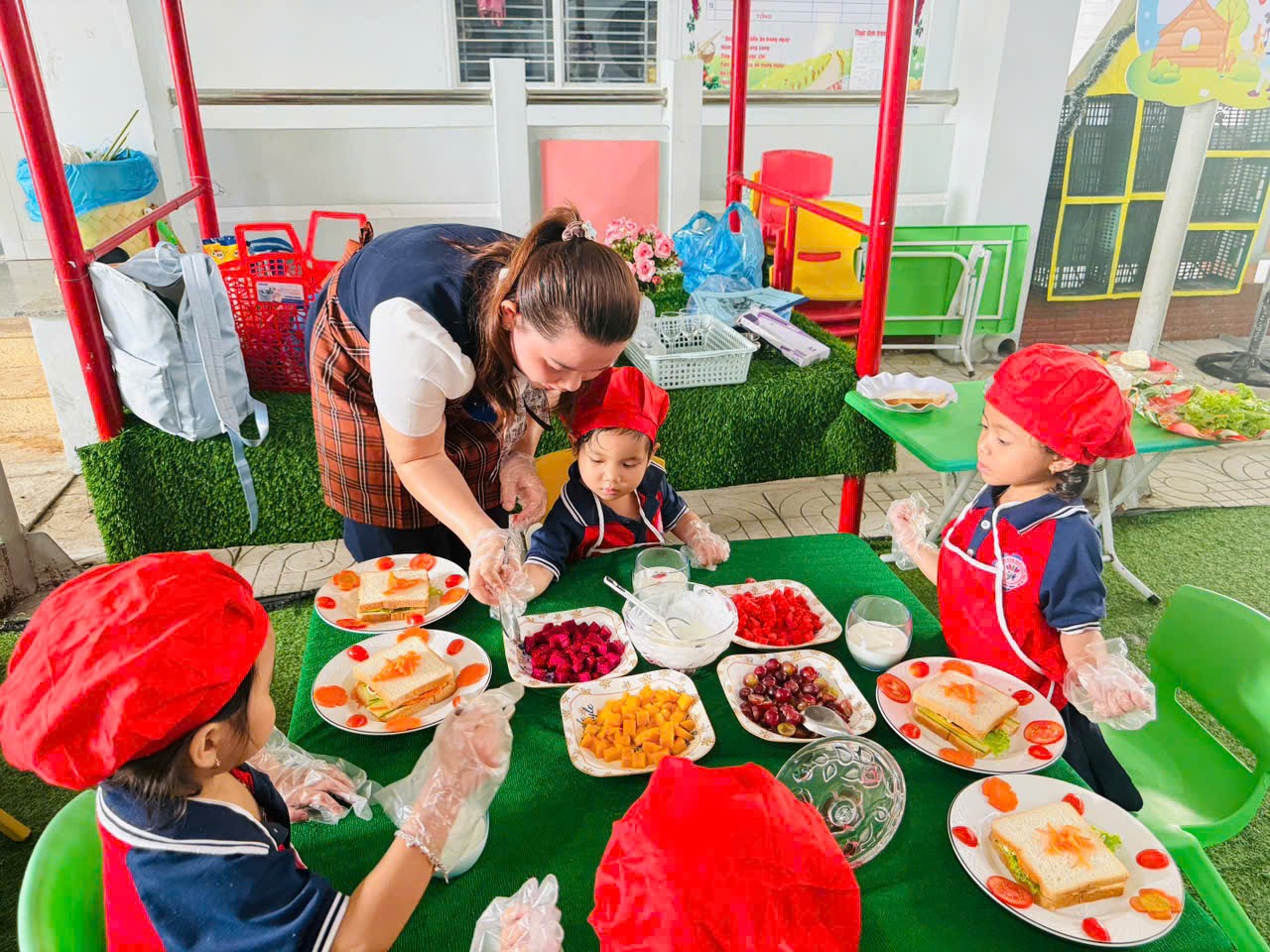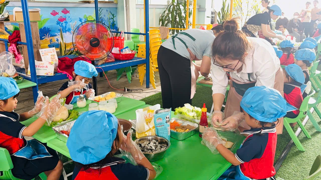 🌹Trong quá trình tham gia, giáo viên vừa trực tiếp thực hiện mẫu, vừa hướng dẫn, hỗ trợ và gợi mở để trẻ cùng tham gia chế biến và trang trí các món ăn. Các bé được trải nghiệm các công việc như chuẩn bị nguyên liệu, sắp xếp, bày trí món ăn một cách gọn gàng, đẹp mắt. Dưới sự hướng dẫn tận tình của cô, các bé mạnh dạn, tự tin và tích cực tham gia vào từng hoạt động.