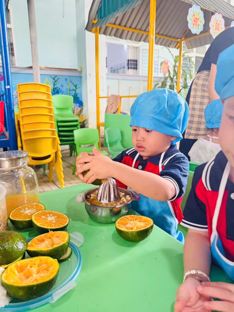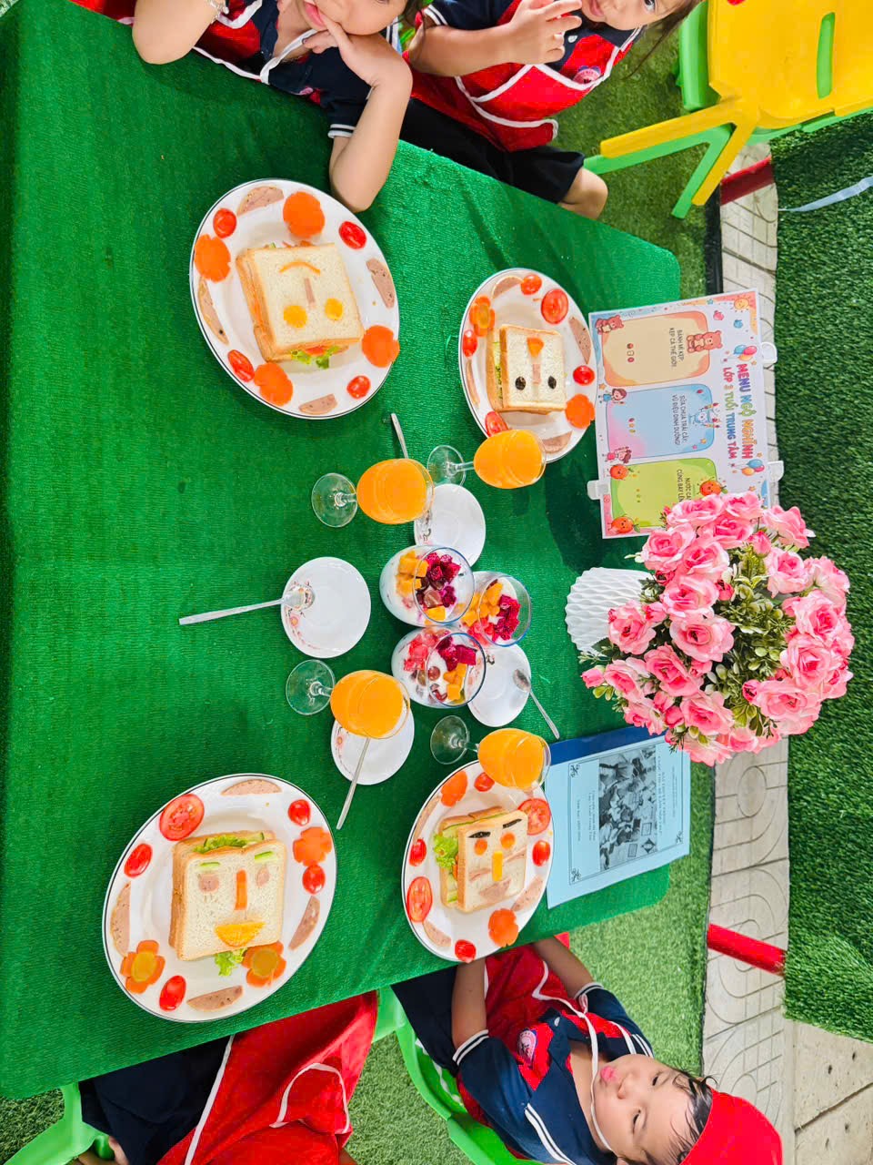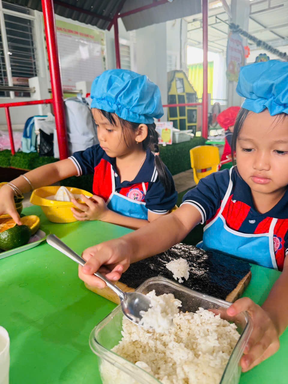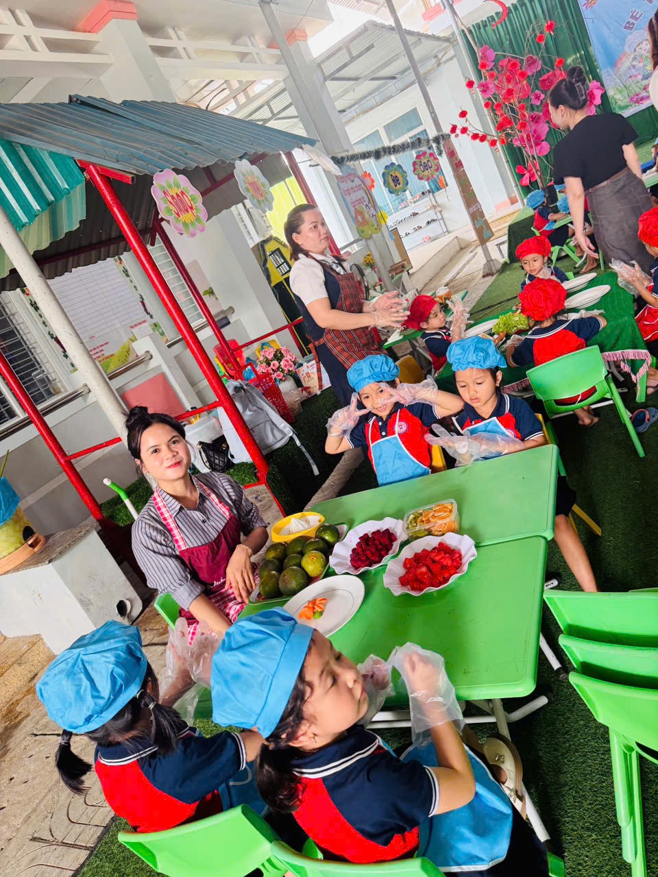 🌹Trong quá trình tham gia, giáo viên vừa trực tiếp thực hiện mẫu, vừa hướng dẫn, hỗ trợ và gợi mở để trẻ cùng tham gia chế biến và trang trí các món ăn. Các bé được trải nghiệm các công việc như chuẩn bị nguyên liệu, sắp xếp, bày trí món ăn một cách gọn gàng, đẹp mắt. Dưới sự hướng dẫn tận tình của cô, các bé mạnh dạn, tự tin và tích cực tham gia vào từng hoạt động.