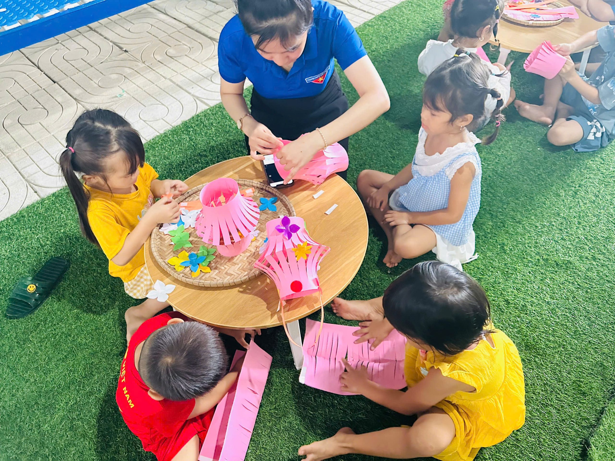 Các cháu tập trung để hoàn thiện lồng đèn của mình, rất phấn khích khi xem múa lân, vui mừng khi được phá cỗ, ăn bánh kẹo.